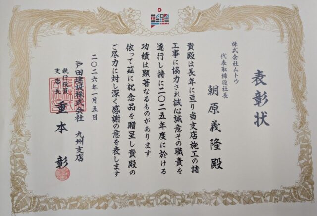 またこのたび、戸田建設株式会社 九州支店様より表彰状を拝受いたしました。